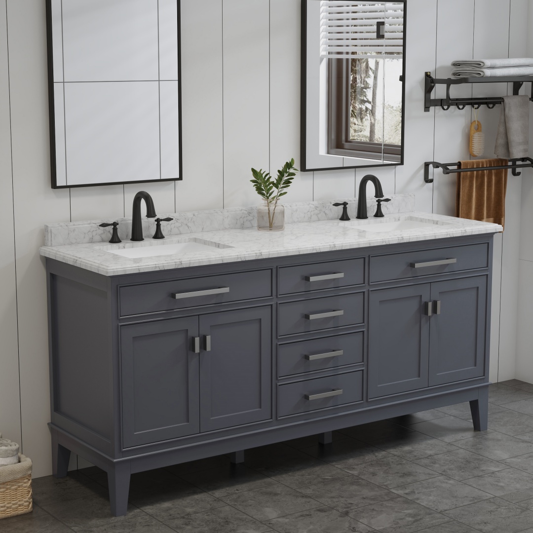 Make a statement in your bathroom with this 72-inch Transitional Bathroom Vanity, where classic elegance meets modern design. Finished in a crisp white and topped with a stunning Carrara marble countertop, this vanity instantly elevates your space with a clean, sophisticated look.